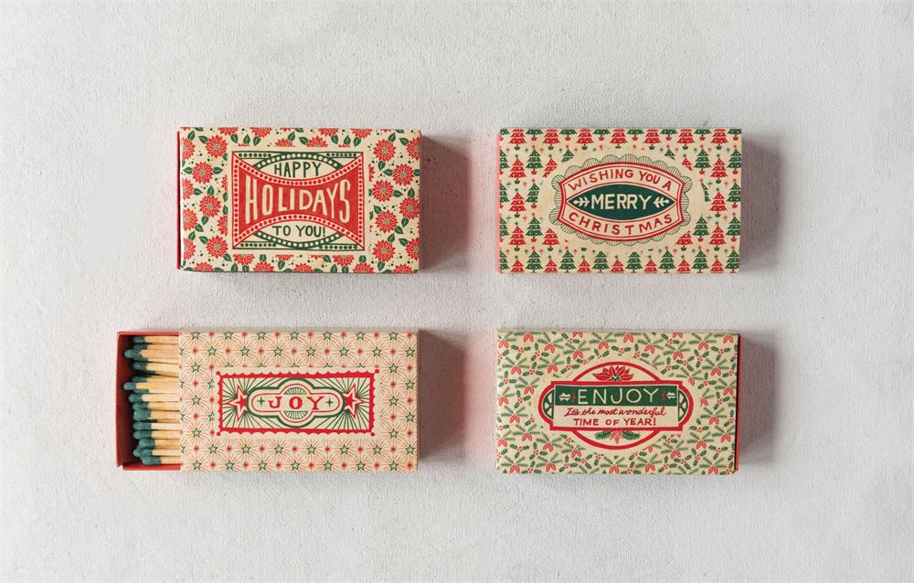 This Christmas Matchbox with safety matches in 4 styles with different holiday sayings is nice for the powder room and pretty enough to leave out as a display to light up your holiday. Great gift add-ons!