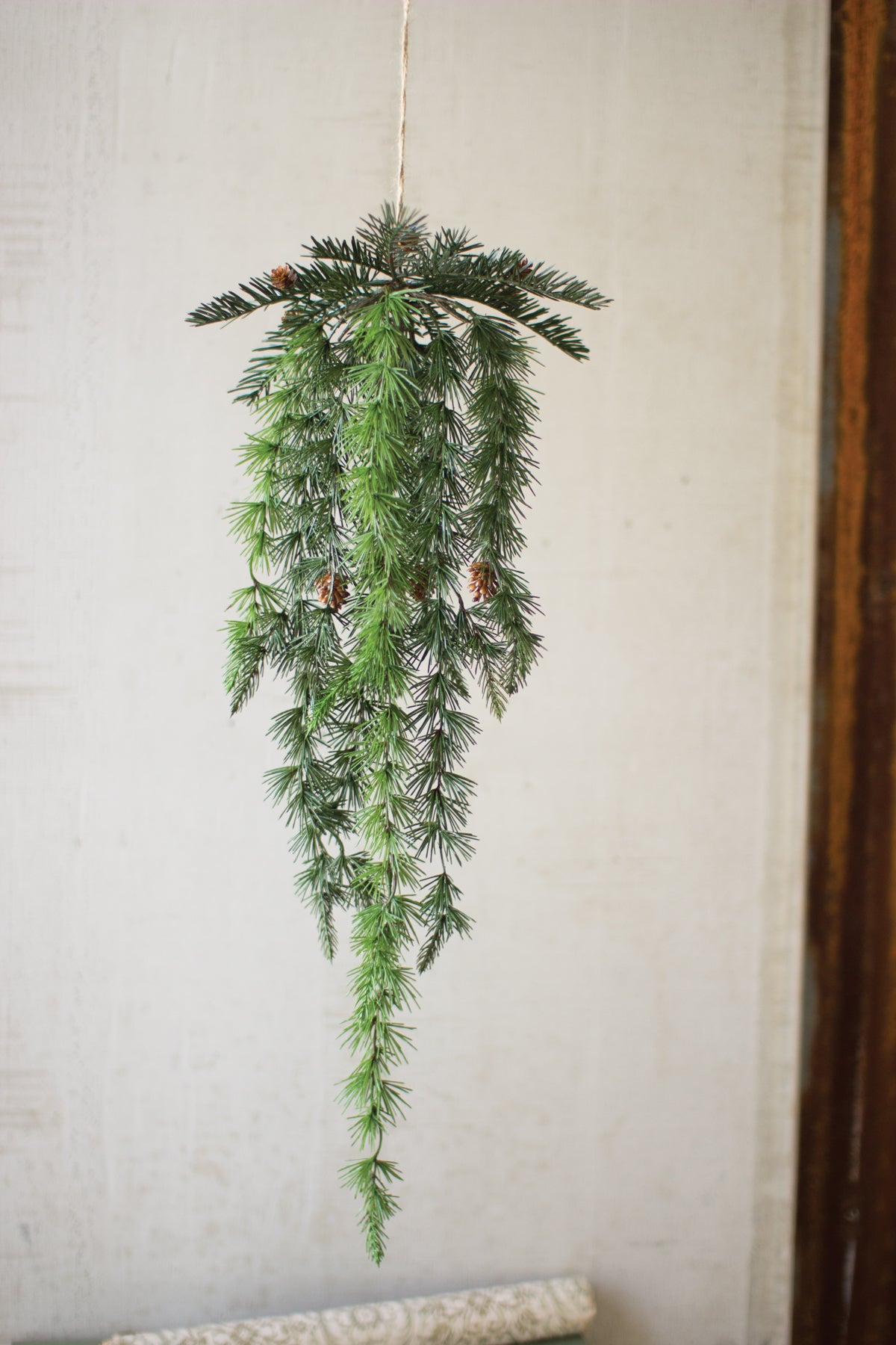 This hanging pine spray brings the beauty of the outdoors inside with its realistic cascading greenery and natural pinecones. A simple, timeless accent that adds a fresh, festive touch to mantels, doorways, and holiday displays.