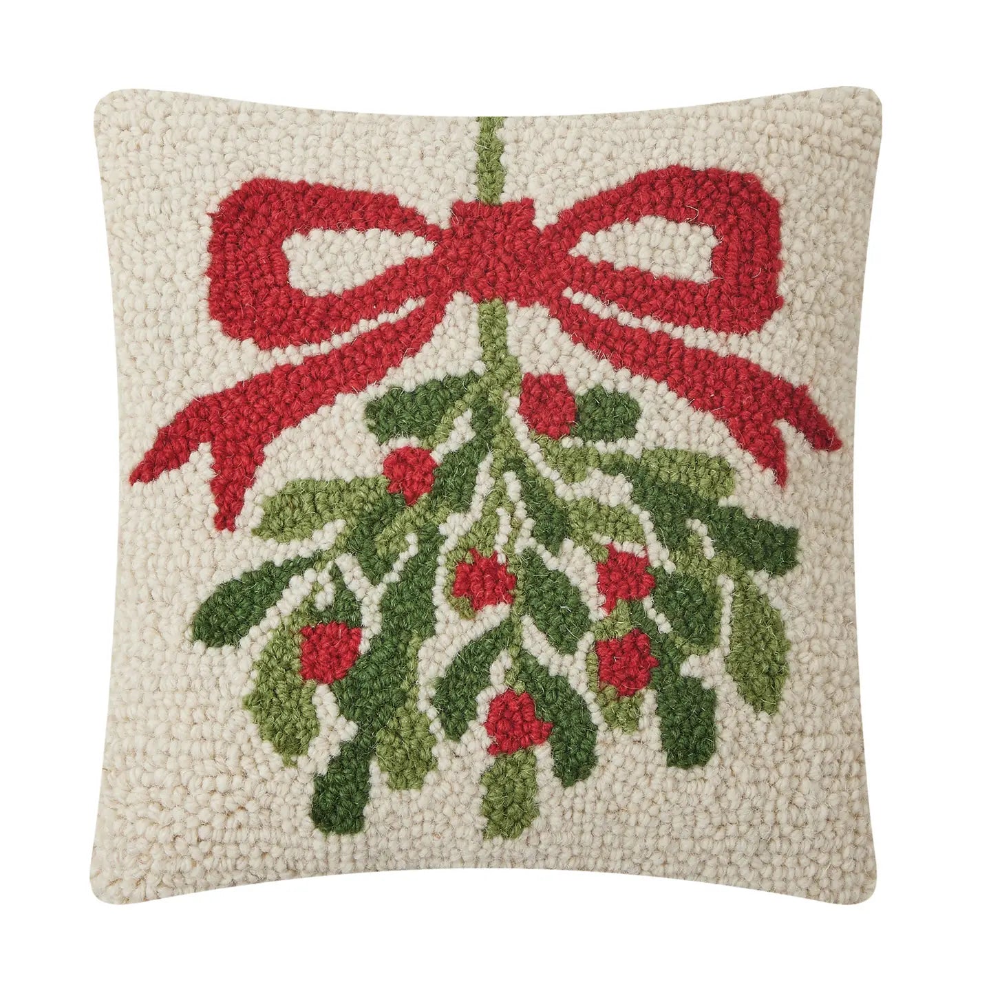This Mistletoe Hook Pillow features a classic sprig of mistletoe tied with a bold red bow, set against a warm cream background. Its hand-hooked texture and timeless holiday design make it a charming accent for sofas, chairs, or cozy corners all season long.