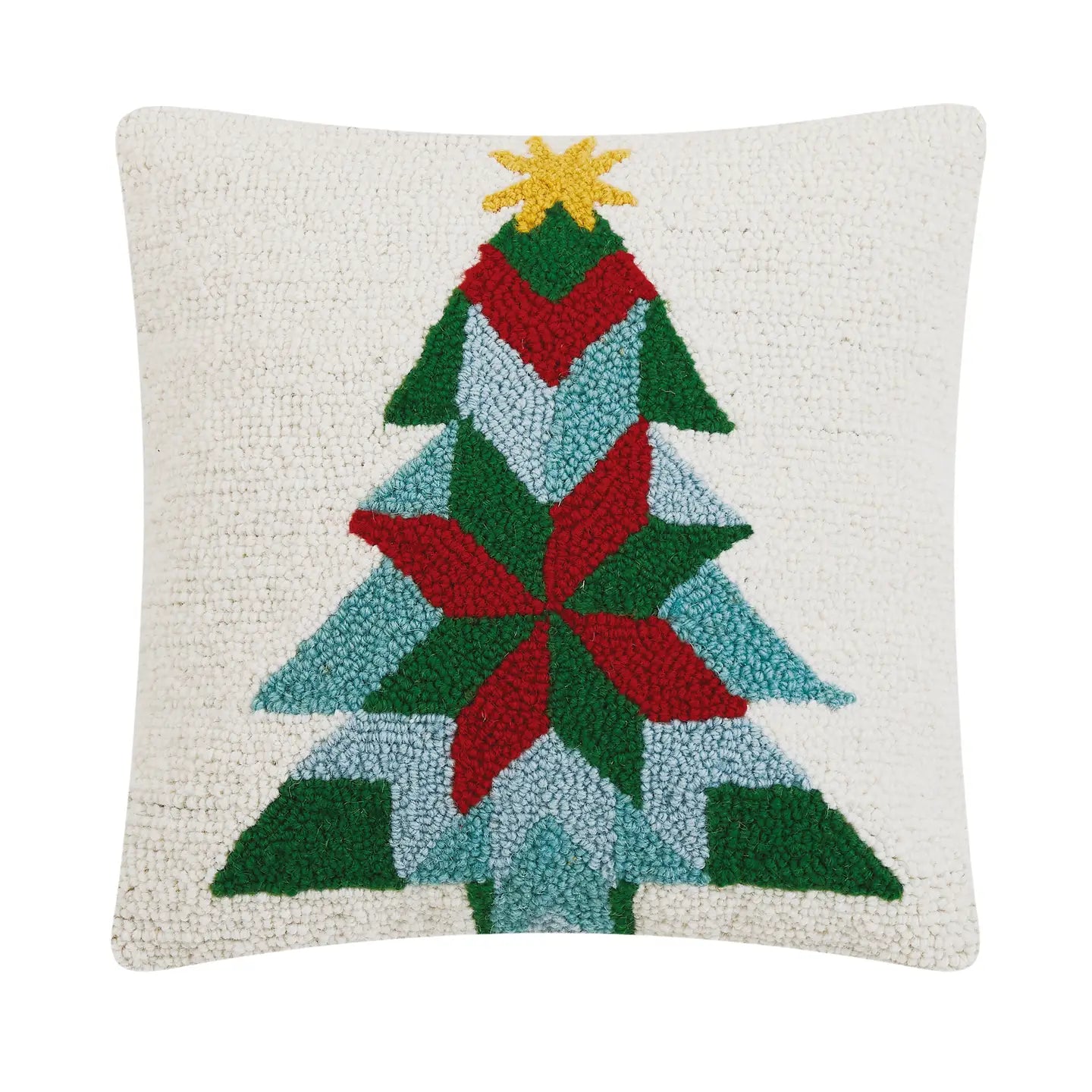 This charming patchwork tree pillow features a geometric Christmas tree design in classic holiday hues topped with a golden star, all set against a soft cream background. A cozy, handcrafted look that adds festive texture and timeless seasonal charm to any space.