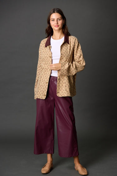 The Mulberry Barn Coat brings vintage charm with a modern twist. Featuring a subtle floral print and contrasting corduroy collar, it’s the perfect lightweight long sleeve for crisp mornings or laid-back weekends. Style it over denim or dresses for an effortlessly rustic look that’s true to Texas fall.