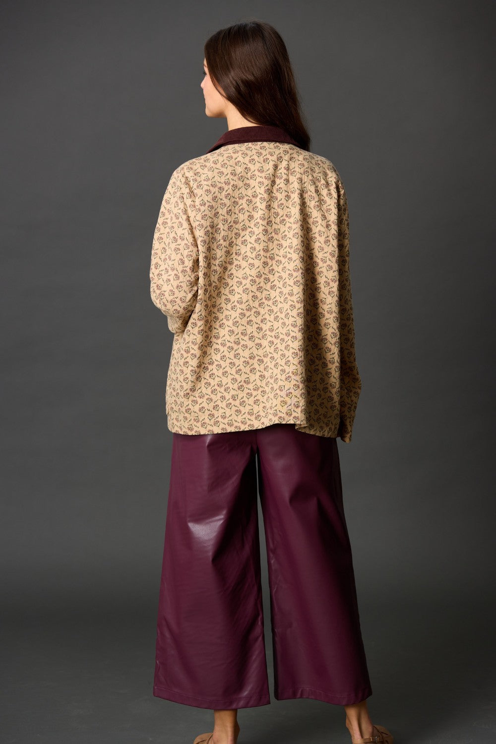 • Features: floral print, contrast corduroy collar, front pockets, button-front closure, long sleeves