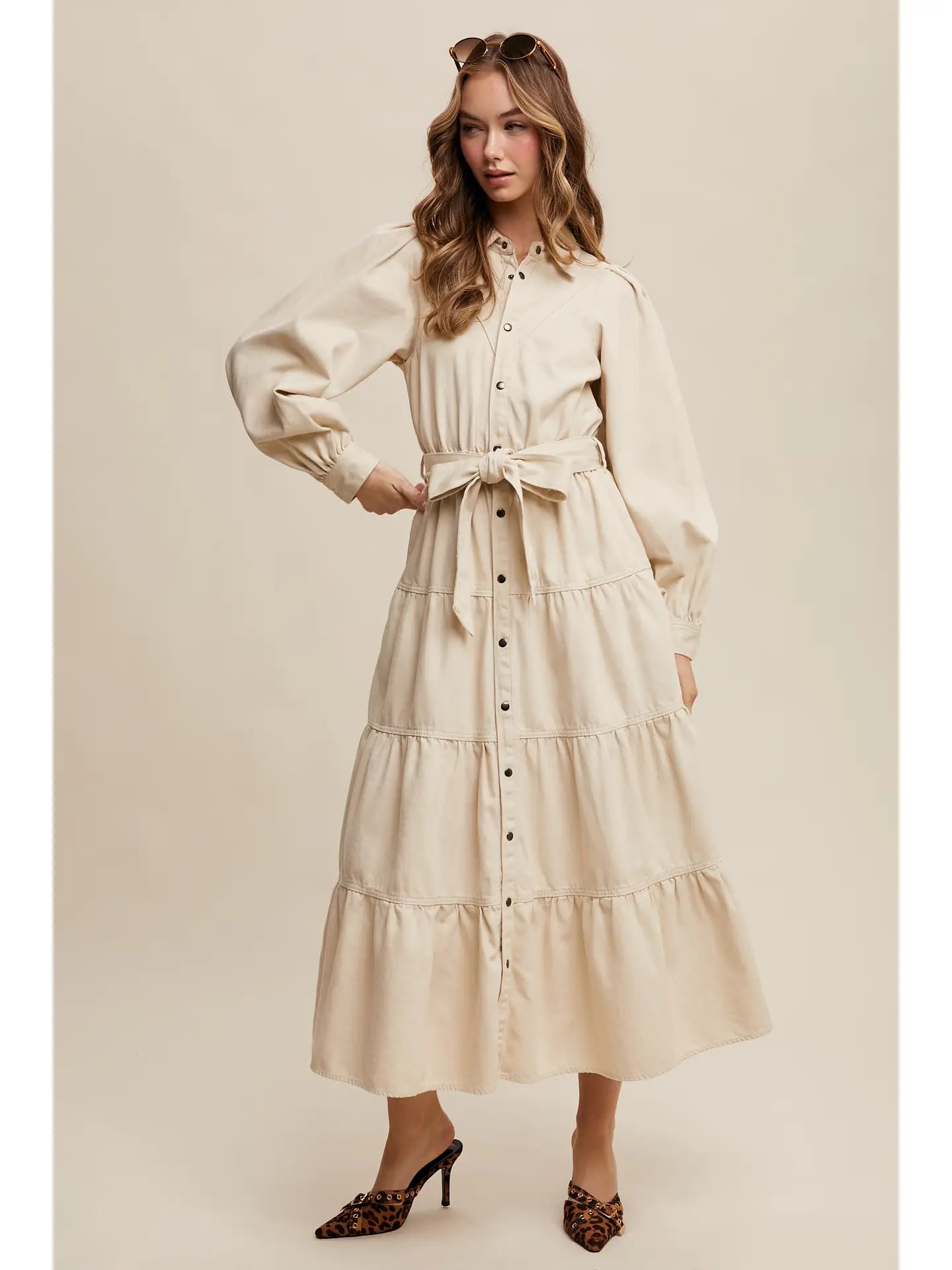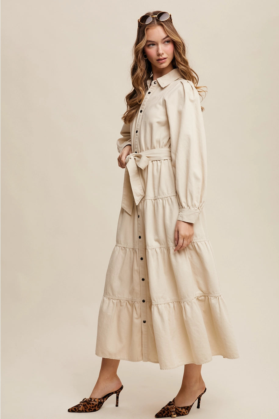 Meet your new go-to: the Bone Tiered Maxi Dress—easy, timeless, and made for everyday wear with a western twist. Designed with long balloon sleeves, a full button front, and a flowy tiered skirt that moves with you, it’s finished with a soft bow detail at the waist for a flattering touch. Style it with booties for a classic western look or throw on sneakers for a casual, effortless day out.