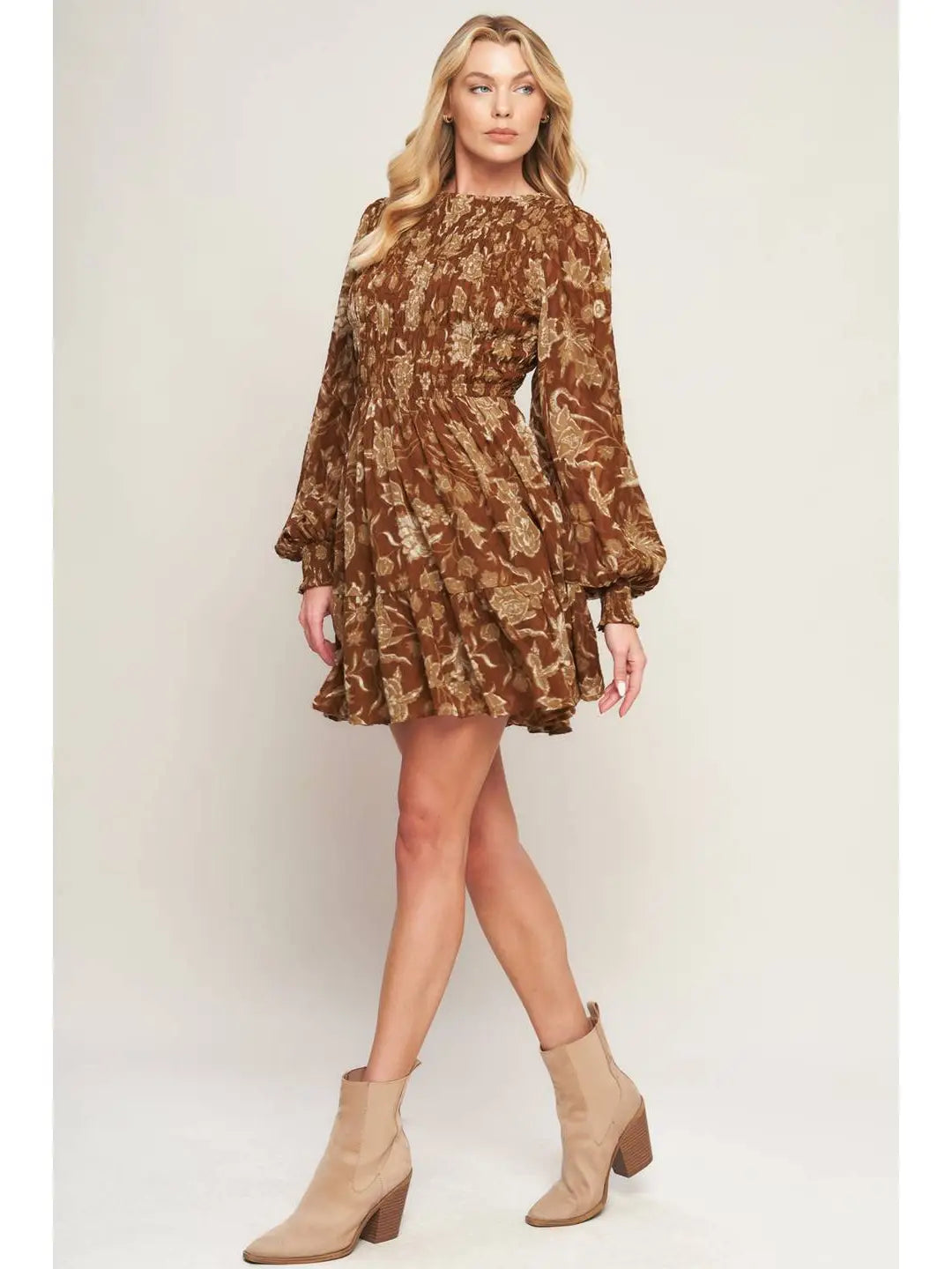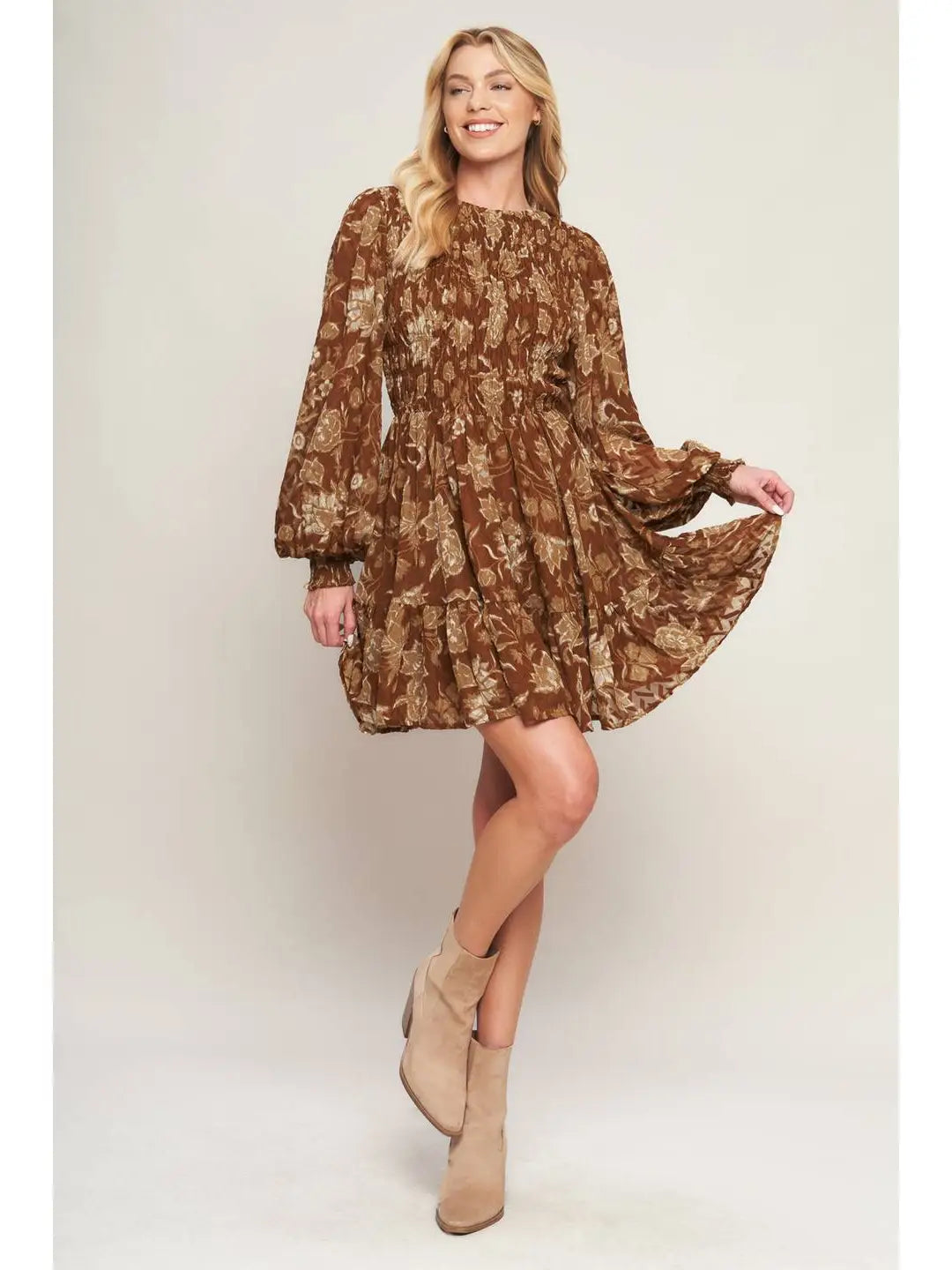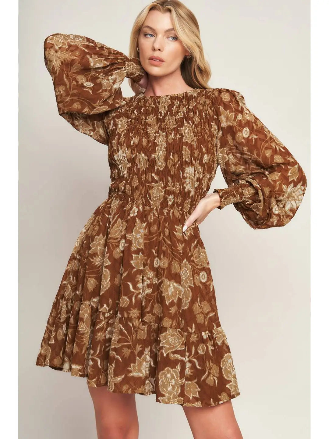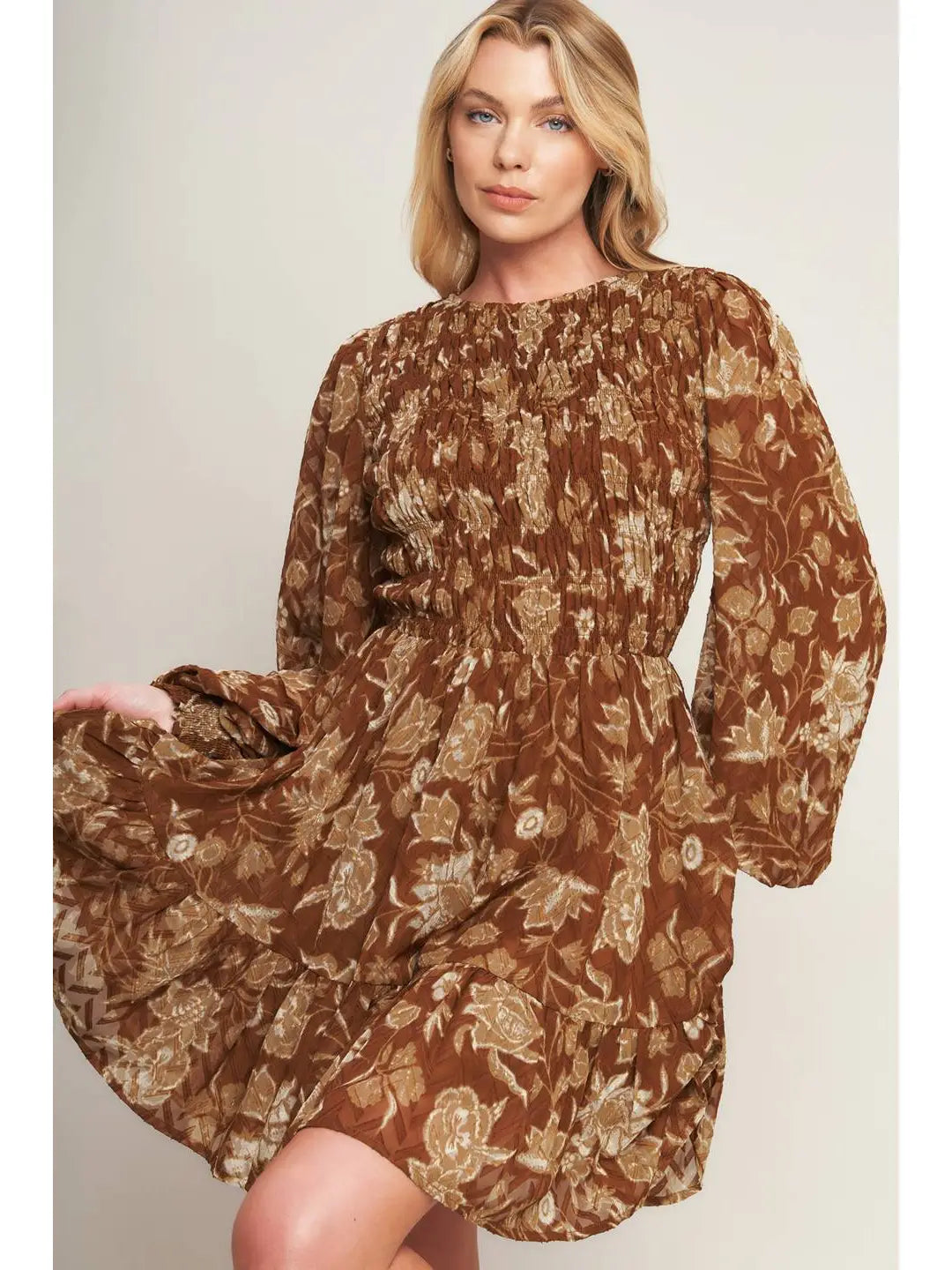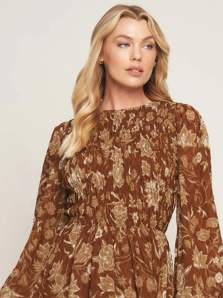 The Golden Meadow Smocked Dress features a warm, earthy brown base with soft beige and muted ivory floral details in a vintage-inspired botanical print. The smocked bodice creates a flattering, feminine silhouette, complemented by a round neckline, long balloon sleeves, and a tiered skirt that adds easy movement. Pair this mini dress with your favorite boots for a casual western look that moves effortlessly from day to night.