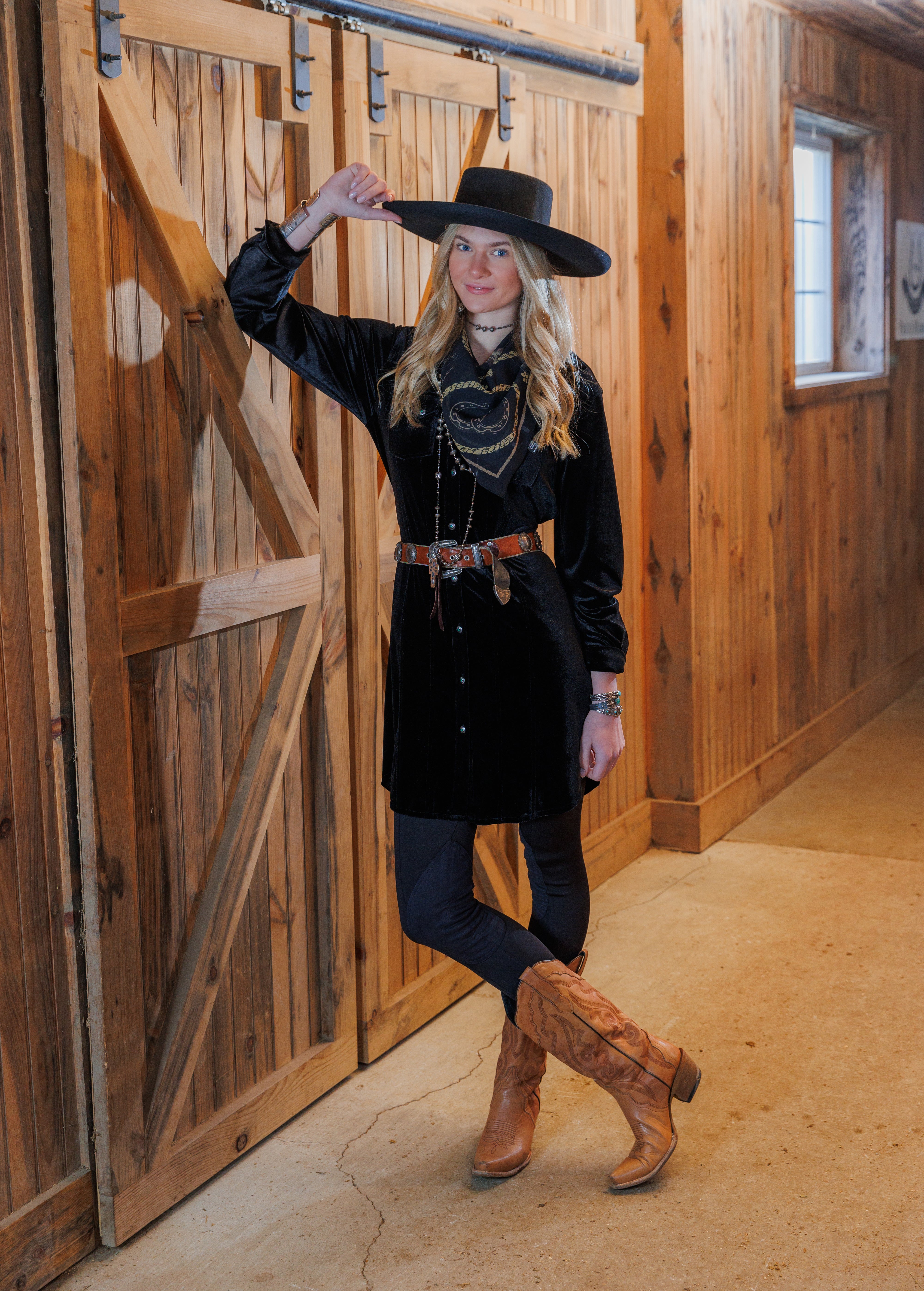 The Onyx Velvet Tunic brings a touch of western sophistication to any wardrobe. Crafted in a soft, luxe velvet with turquoise concho buttons, this long-sleeve Tasha Polizzi piece blends timeless charm with modern flair. The adjustable front tie cinches the waist for a flattering fit on every body type. Style it as a dress with boots and a statement belt or wear it open over jeans for a more laid-back look. Perfect for dinners, nights out, or western-themed events.