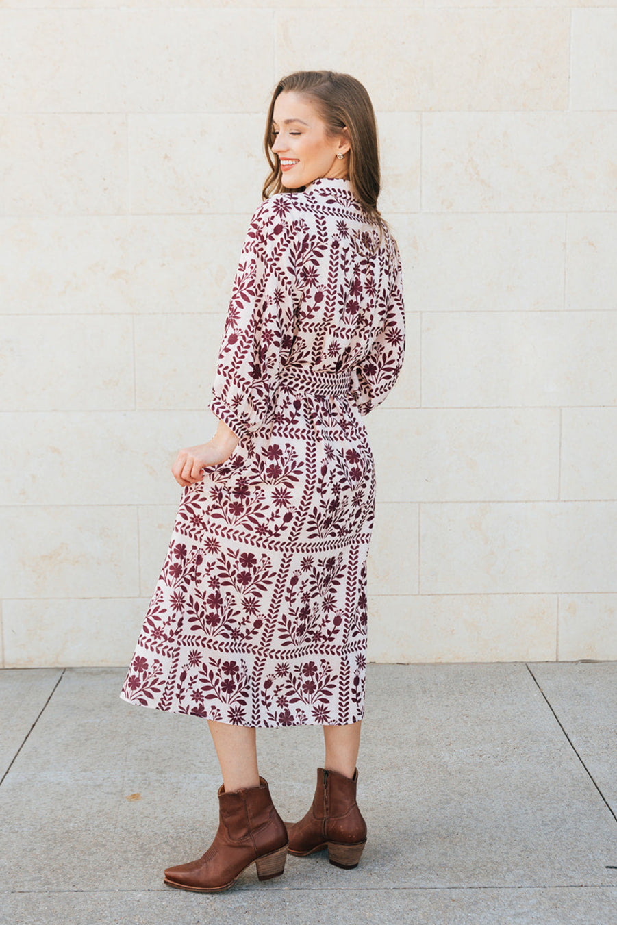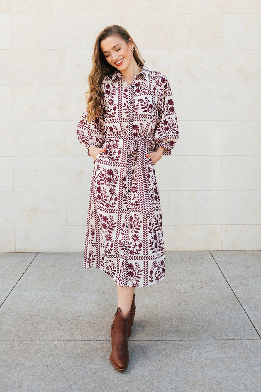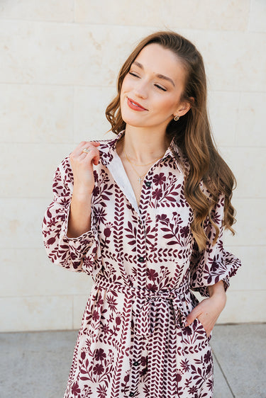 The Stadium Stroll Dress is a game day essential. Featuring a unique burgundy floral print, this midi dress was made for your fall wardrobe. The adjustable self-tie waist lets you create a feminine bow detail, highlighting your figure while keeping the look comfortable and flattering.