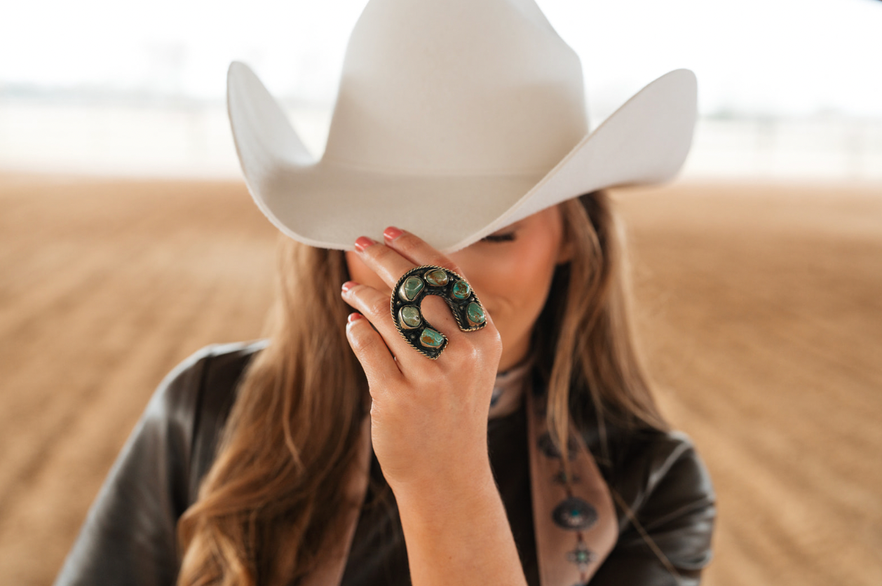 This turquoise horseshoe ring brings a worn-in western soul with a timeless, vintage feel. Set with varied turquoise stones and framed by hand-worked silver detailing, every curve shows off its rustic character and craftsmanship. Wear it as a ring or slip it onto a scarf slide—this piece is made to move with you and add a grounded western edge to whatever you pair it with.