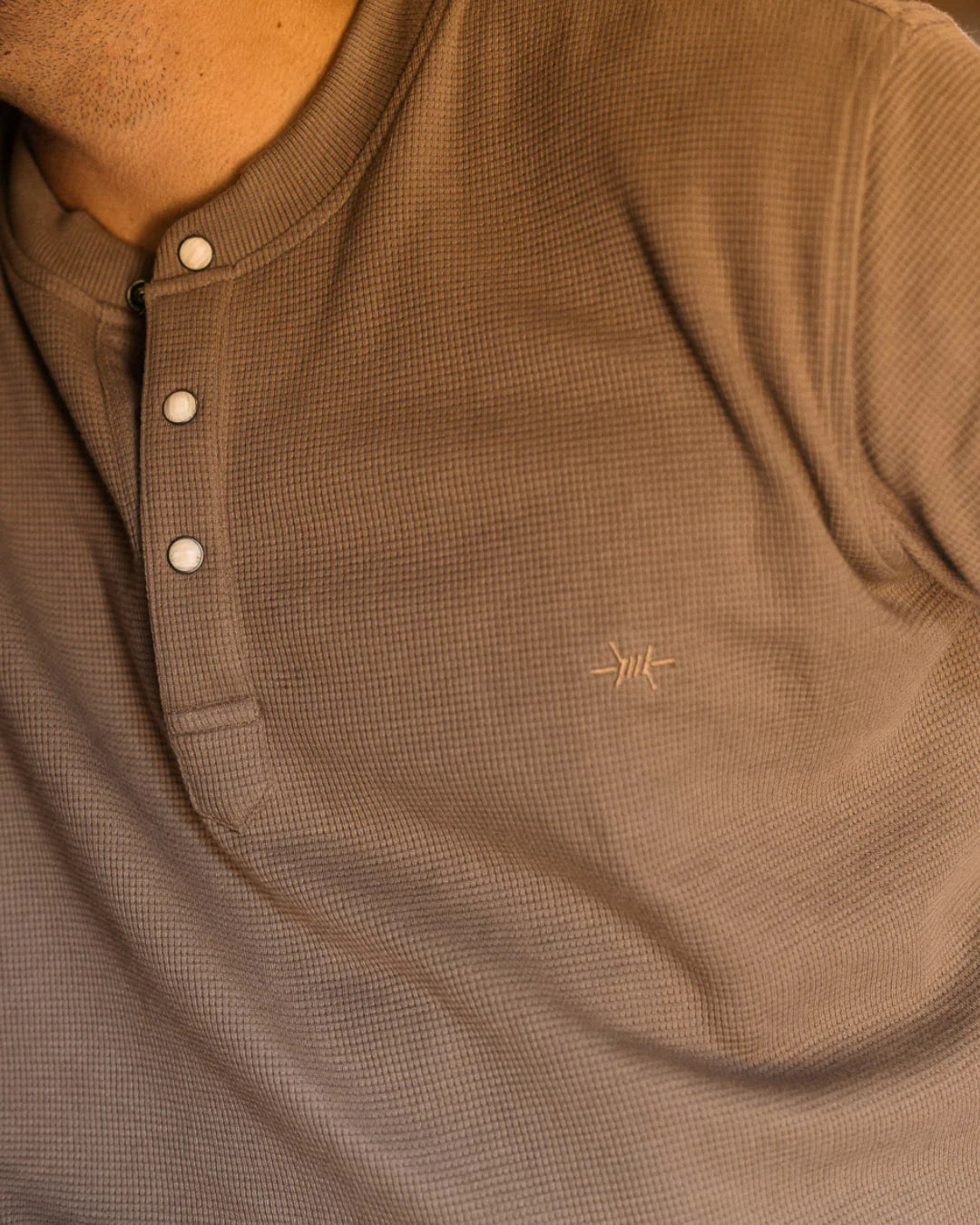 The Pecan Henley by Texas Standard is crafted in a rich brown with a lightweight waffle knit that’s breathable, soft, and built for everyday wear. Finished with a classic pearl-snap buttons, it’s easy to wear on its own or layered under a vest when temperatures start to dip. Comfortable yet polished, this henley keeps you warm without feeling heavy—perfect for changing seasons.