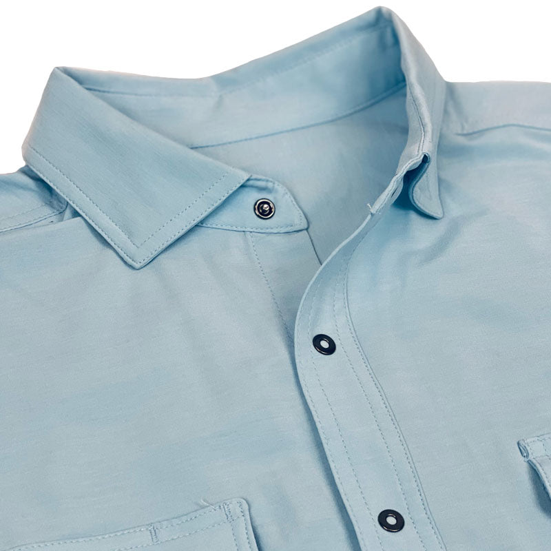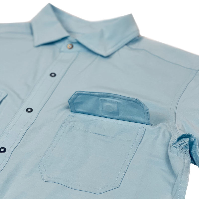Built for the Southern lifestyle, this shirt is lightweight and breathable—made to handle warm days with ease. Designed with a tailored fit , it moves with you while keeping a clean, elevated look. Polished without feeling overdone, it strikes that balance between relaxed and refined. Finished in a light blue with chest pockets and built-in ventilation, it keeps you cool when the heat rises and pairs effortlessly with white linen pants for an easy, put-together spring or summer look.