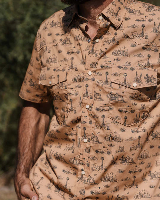 The West Texas Toile Pearl Snap by Texas Standard brings classic western grit to a lightweight, everyday short sleeve. Done in a warm sand tone, this collared pearl snap features an all-over toile print of windmills, oil rigs, cattle, desert brush, and wide-open ranch scenes that nod to true West Texas roots. Finished with dual front pockets and snap closures, it’s an easy-wearing staple built for long days, late nights, and everything in between.