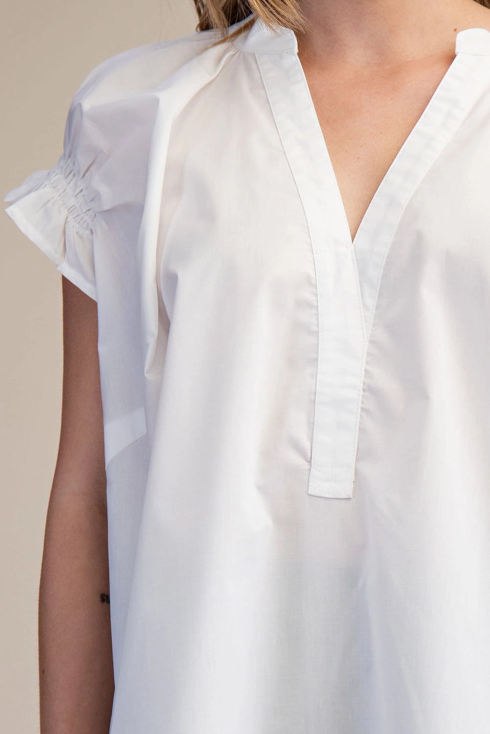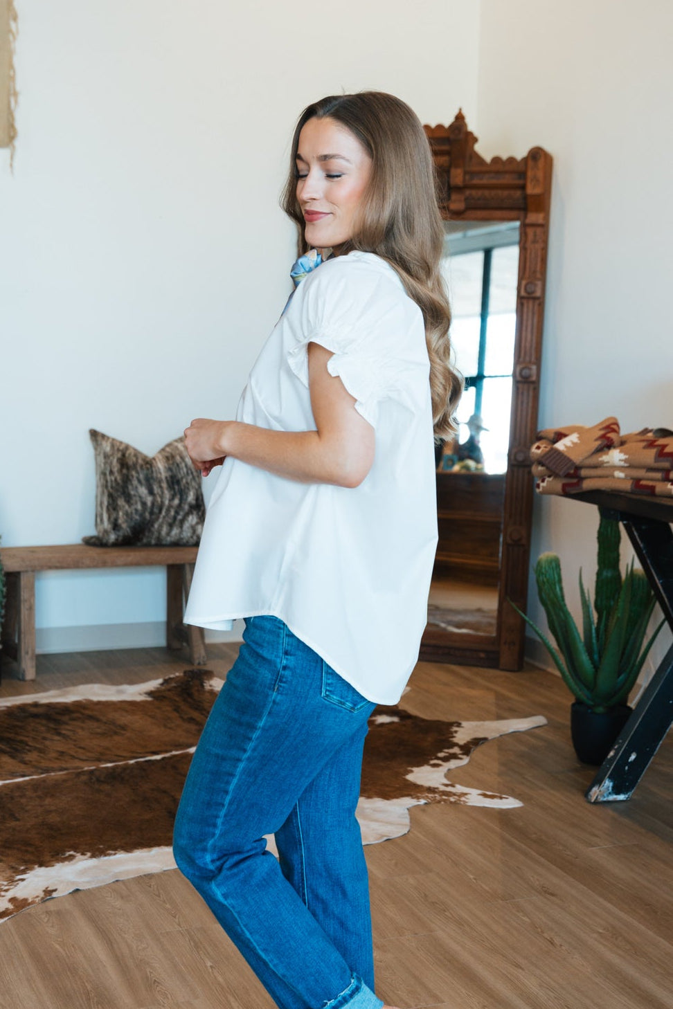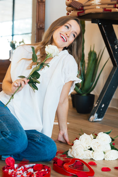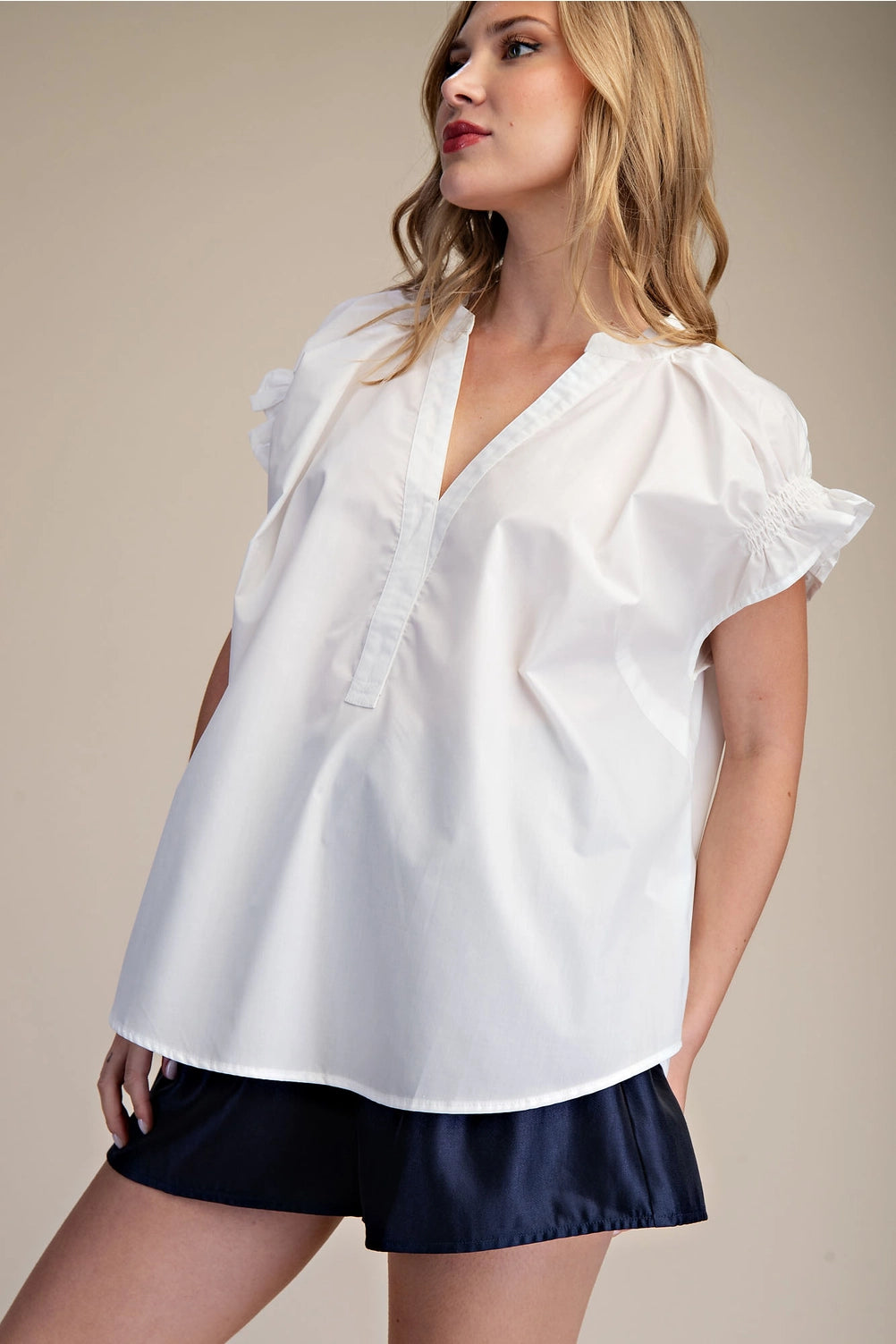 A clean, polished staple with just the right amount of detail, this white v-neck top features soft puff sleeves finished with a subtle ruffle for an elevated everyday look. Designed without lining yet crafted to remain non-sheer, it offers lightweight comfort with confident coverage. An easy go-to you’ll reach for again and again—style it with tailored slacks and flats for work, or keep it casual with jeans and sandals for a day out with friends.