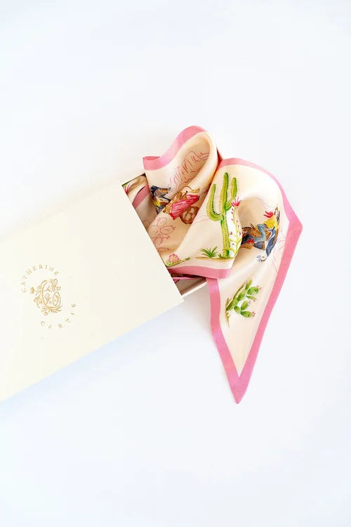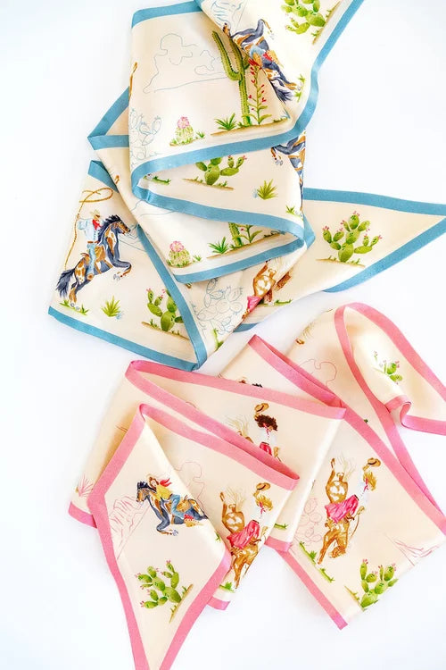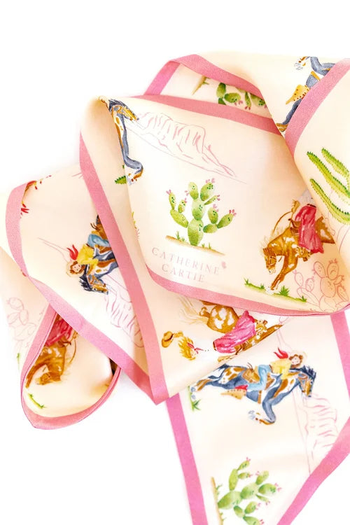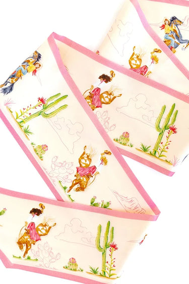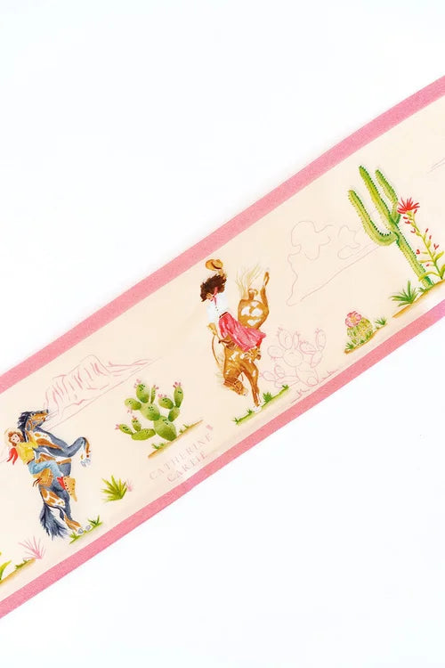 Originally painted by Catherine for Dondolo’s Western Classics collection, the Rodeo Cowgirl pattern was too striking not to live beyond apparel. Reimagined as a ribbon, this design features a soft pink colorway and beautifully illustrated rodeo cowgirls. It’s a timeless nod to western heritage with a fresh, feminine finish.