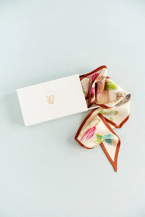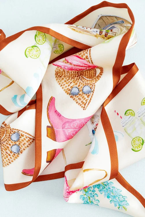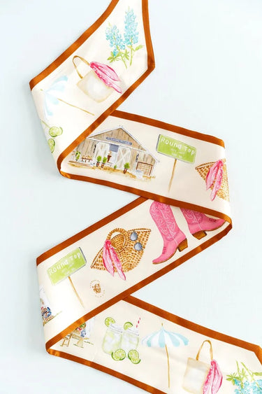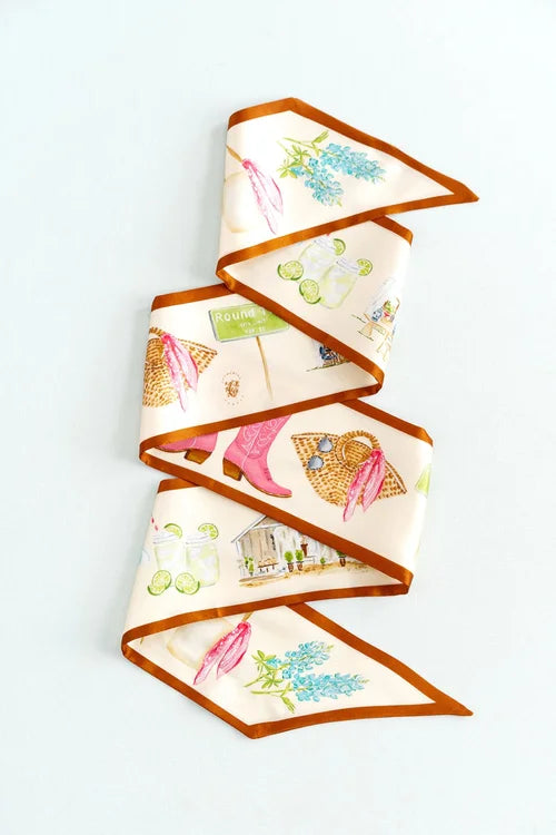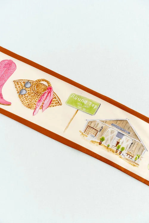 This ribbon scarf is a love letter to Round Top, designed for styling without rules—tie it at the neck, wrap it on a hat or bag, or layer it with a charm. Hand-illustrated by Catherine Cartie in watercolor, it features iconic Round Top details from vintage boots and bluebonnets to Marburger tents and the city limits sign.