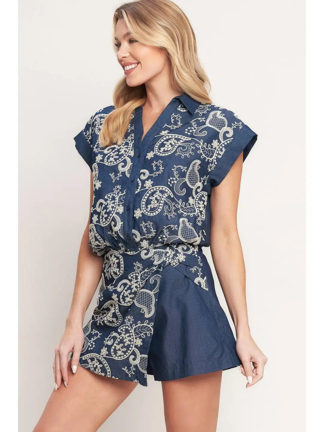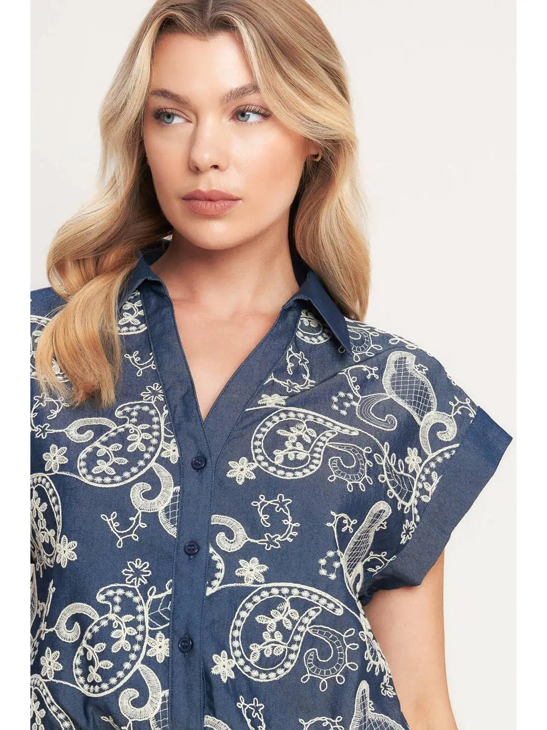 Designed with a structured collar, flattering v-neckline, button-down front, and gently cuffed short sleeves, the Blue Ribbon Embroidery Top features an elastic waist that gives a clean, tucked-in look with all-day comfort. Finished in a rich navy with crisp white paisley and floral embroidery, it pairs perfectly with the Blue Ribbon Embroidery Skort for a pulled-together matching set—ideal for spring and summer plans from country concerts to brunch dates and everything in between.