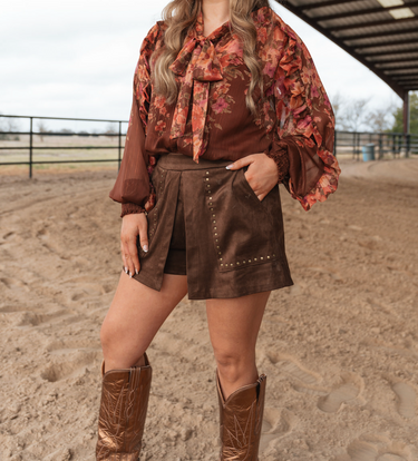 This suede high-waist skort blends feminine shape with an edge, featuring metallic stud detailing along the front pockets for a bold finish. With the ease of shorts underneath and the look of a skirt on top, it’s a standout piece that moves effortlessly from day to night—style it with a bodysuit and heeled boots for a night out, or pair it with a flowy white blouse and cowgirl boots for a western-leaning look. An easy statement-maker for any closet.