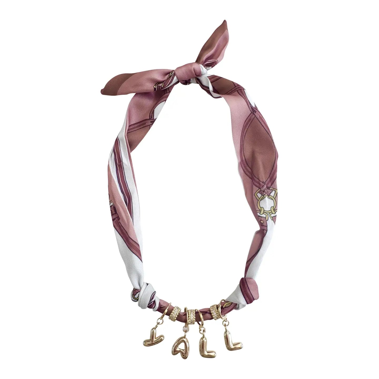 This statement bandana necklace brings western spirit with a polished twist. The satin bandana features a rich mix of maroon, blush, and ivory tones with an equestrian-inspired pattern woven throughout, giving it a classic yet elevated feel. Finished with gold Y’all bubble letter charms, it adds just the right amount of shine and personality. Easy to style and impossible to miss, this piece is made for Aggie game days.
