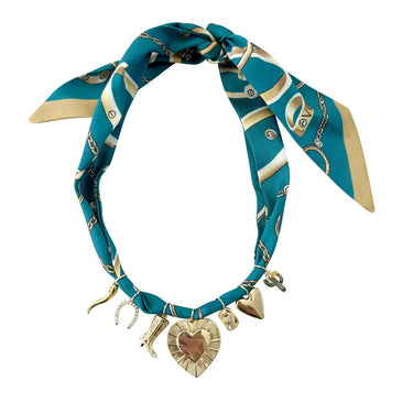 - Materials: satin scarf, 18k gold plated charms