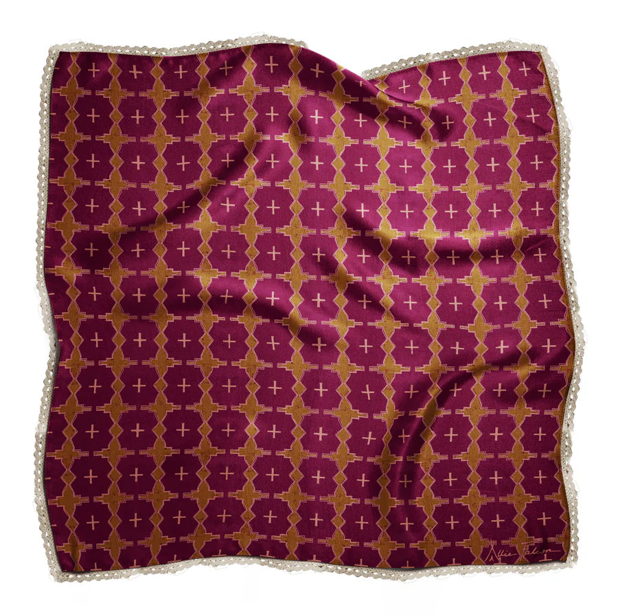 This magenta scarf is finished with a cream-colored crochet trim for a soft, feminine touch. Its repeating geometric cross pattern brings in a modern western vibe, making it an easy way to elevate any outfit.