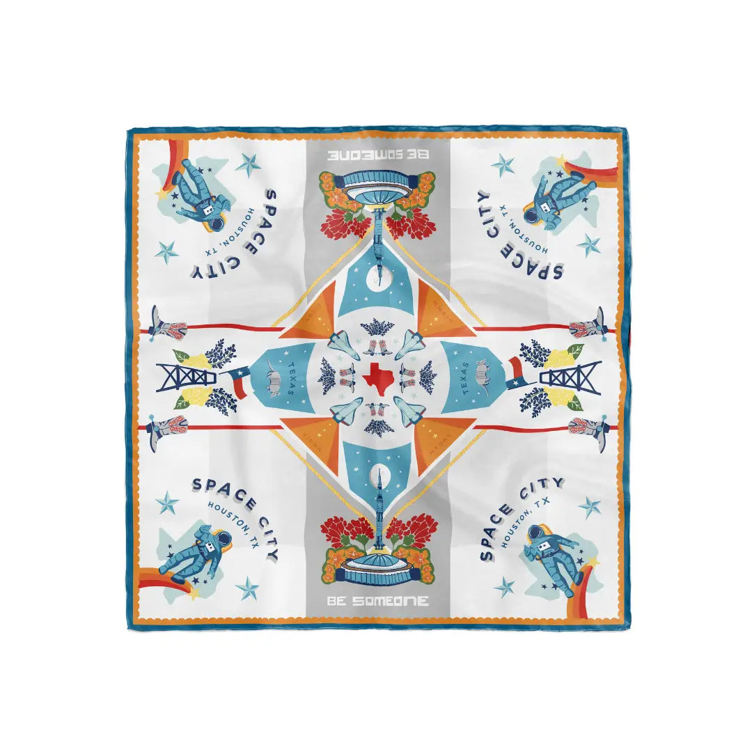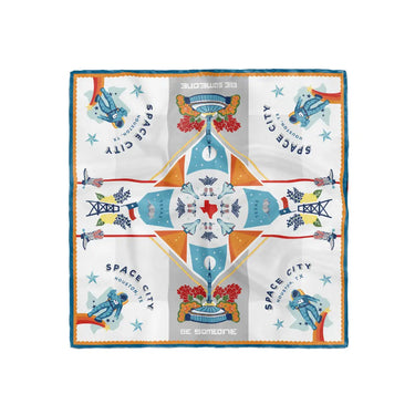 Our Space City silk scarf features a bold, illustrated design inspired by Houston, Texas, blending retro space graphics with Lone Star details. Astronauts, rockets, stars, bluebonnets, and oil derricks are arranged in a striking symmetrical layout, finished with a contrasting border for a statement look that feels playful, graphic, and unmistakably Texas.