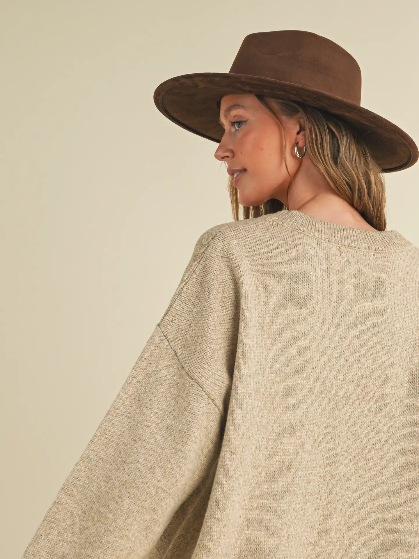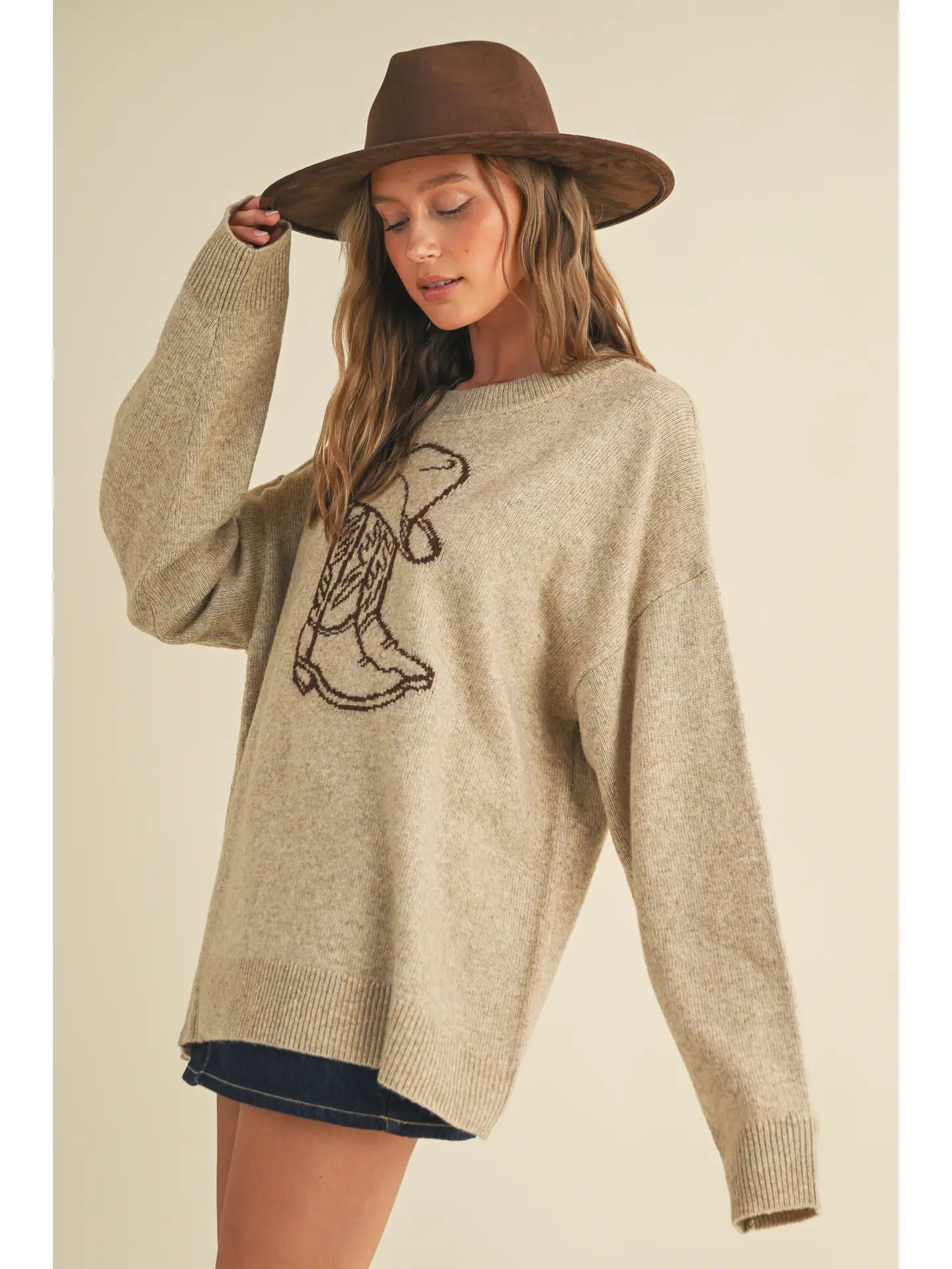 The Rodeo Knit Pullover is a soft, long-sleeve sweater designed with an intentionally oversized fit for effortless, everyday wear. Crafted in a lightweight neutral knit, it features a western-inspired boot graphic topped with a cowboy hat, adding just the right amount of rodeo flair to a timeless silhouette. Comfortable and breathable, this pullover works as an easy standalone piece or layered under a denim jacket for a classic western outfit.