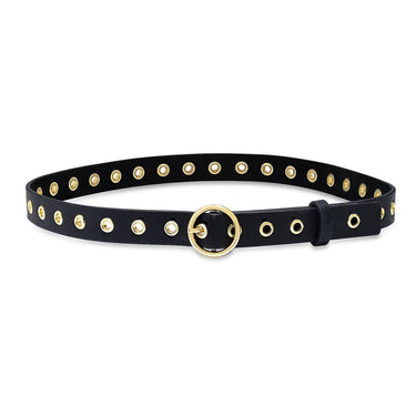 The Black Circa Belt brings a sleek, modern edge with a subtle western nod. Made from smooth black leather, it’s finished with a polished gold round buckle and evenly spaced gold grommet detailing that runs the length for a bold, intentional look. Easy to dress up or down, this belt adds just the right amount of attitude to denim, trousers, or layered over dresses.