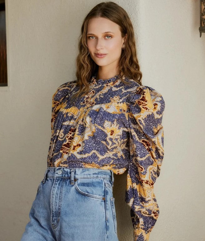 The Irina Blouse by Cleobella is a statement piece with a unique vintage-inspired print in deep indigo and golden tones. Designed with romantic puff sleeves, delicate pleating, and a high neckline, it brings an elevated bohemian touch to any look. Style it with denim or tailored trousers for a polished yet effortless outfit that stands out from day to night.
