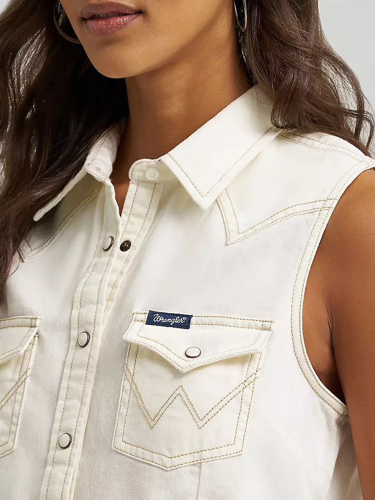 Your favorite western staple, reimagined for warmer days. The Ivory Cowgirl Snap Vest by Wrangler features a cropped, sleeveless silhouette with classic yoke stitching, pearl snap details, and front pockets that keep that iconic look front and center. Feminine and easy to style, it’s one of those pieces you can dress up or down and stay comfortable in all day long.