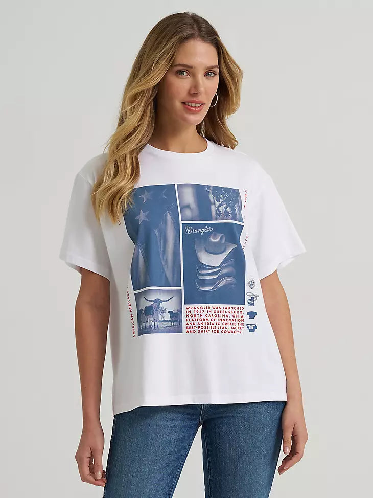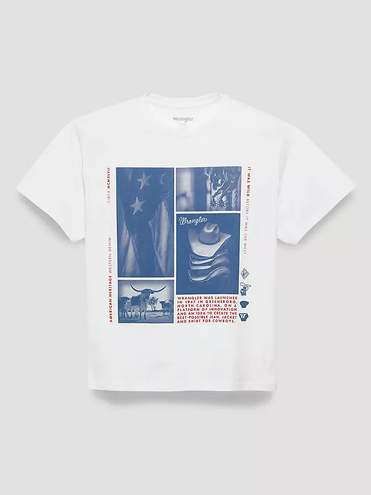 The Western Collage Graphic Tee by Wrangler is an easy everyday staple with a laid-back western feel. Featuring a blue-toned collage of classic western imagery on a crisp white tee, it brings just the right amount of character to your casual lineup. Soft, comfortable, and made for any day—pair it with your favorite denim and sneakers for running errands, lounging at home, or anywhere in between.