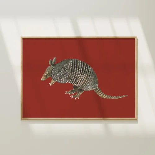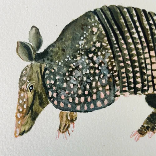 Set on a rich red background, this hand-painted watercolor armadillo brings a nod to the Southwest with a fresh, graphic feel. Part of Catherine Cartie’s Old West series, it balances regional heritage with a clean, classic Western aesthetic.