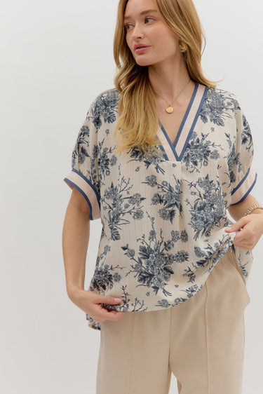 The Blue Willow Blouse features a flattering split neckline accented with contrast trim along the collar and sleeves for a subtle, tailored finish. Designed in soft shades of blue on a cream base, the delicate floral print gives it a timeless, porcelain-inspired feel that’s both classic and eye-catching. Lightweight and breathable for spring and summer, it’s perfect for hot Texas days and easy to style for church, lunch, or the office.