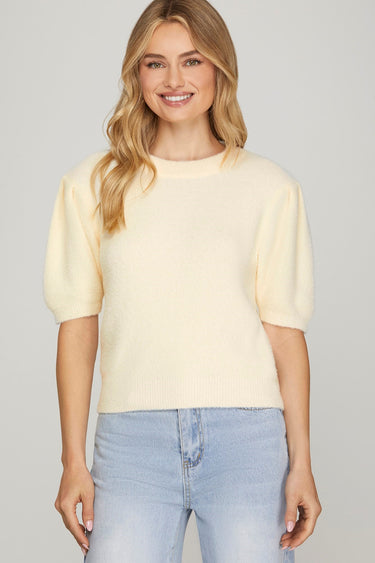 • Features: Soft crewneck sweater with short sleeves and subtle puff shoulder