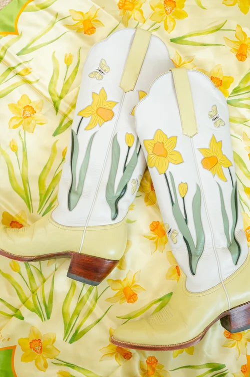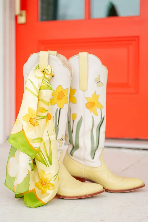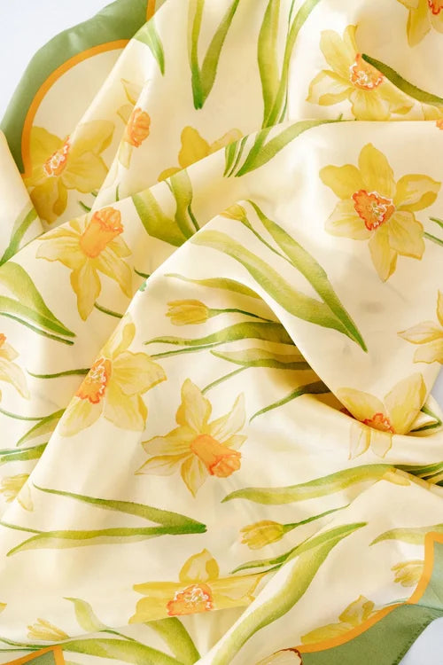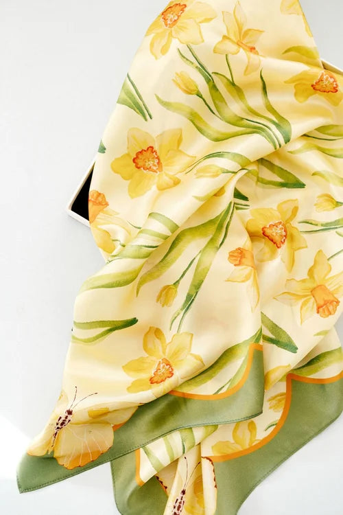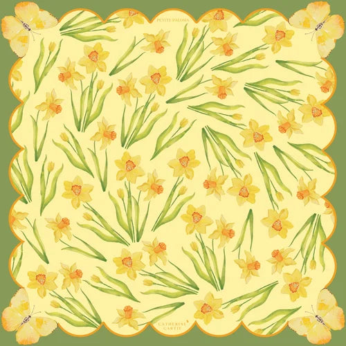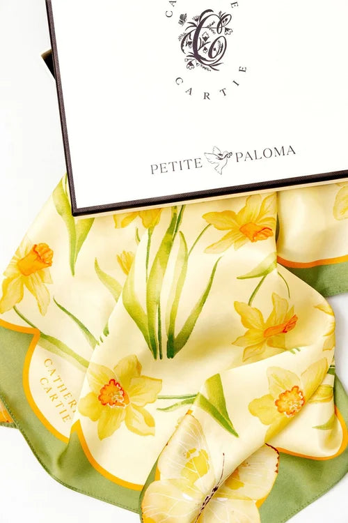 This bright daffodil scarf is part of a collaboration between Catherine Cartie and Petite Paloma. Hand-painted daffodils and soft yellow butterflies dance across a pale yellow, scalloped base, bringing a cheerful, light-filled feel. Finished with a sage green border, this special piece is designed to lift your spirits all year long.