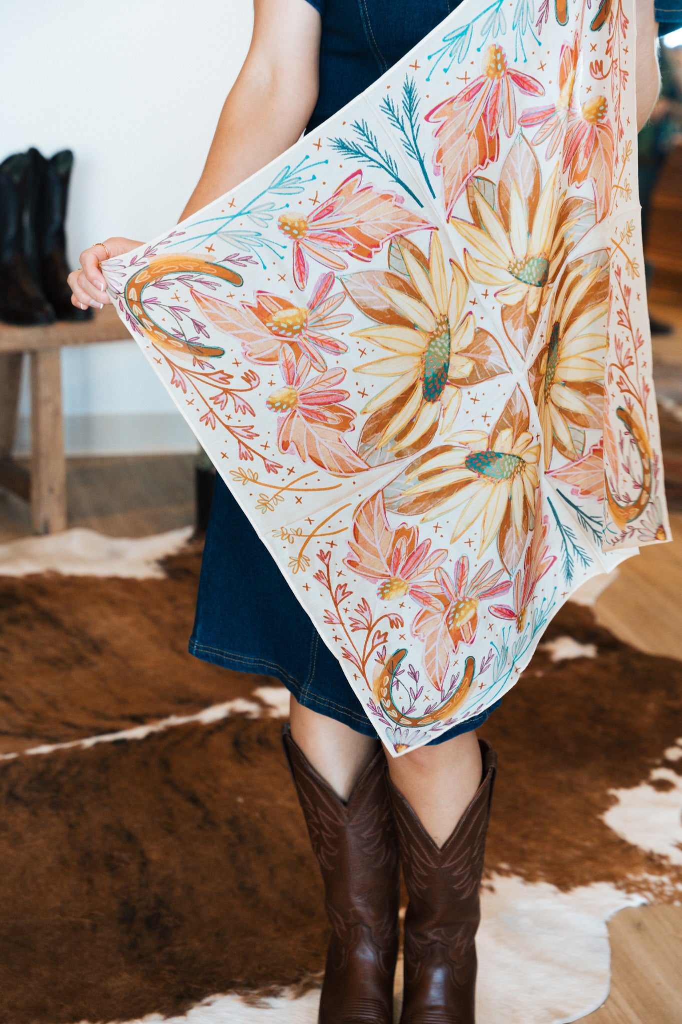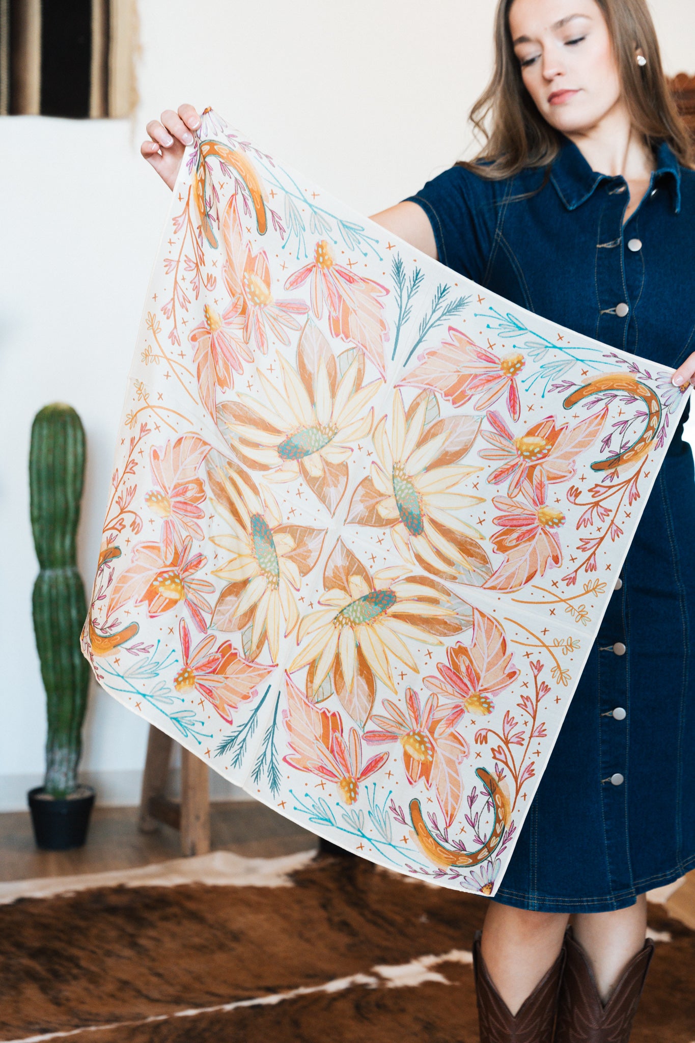 This floral bandana brings bold, sun-washed color to a timeless western accessory, featuring vibrant blooms and subtle horseshoe details in each corner. Lightweight and easy to wear, it’s perfect for warm days on the move or layered year-round for a touch of Lone Star charm. Tie it around your neck for a standout accent that pairs effortlessly with denim, tees, and lived-in boots.