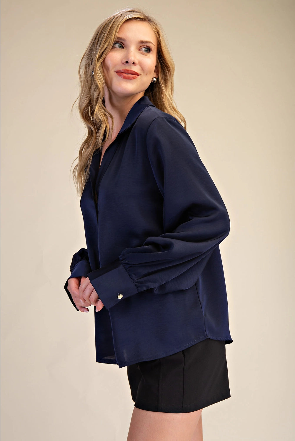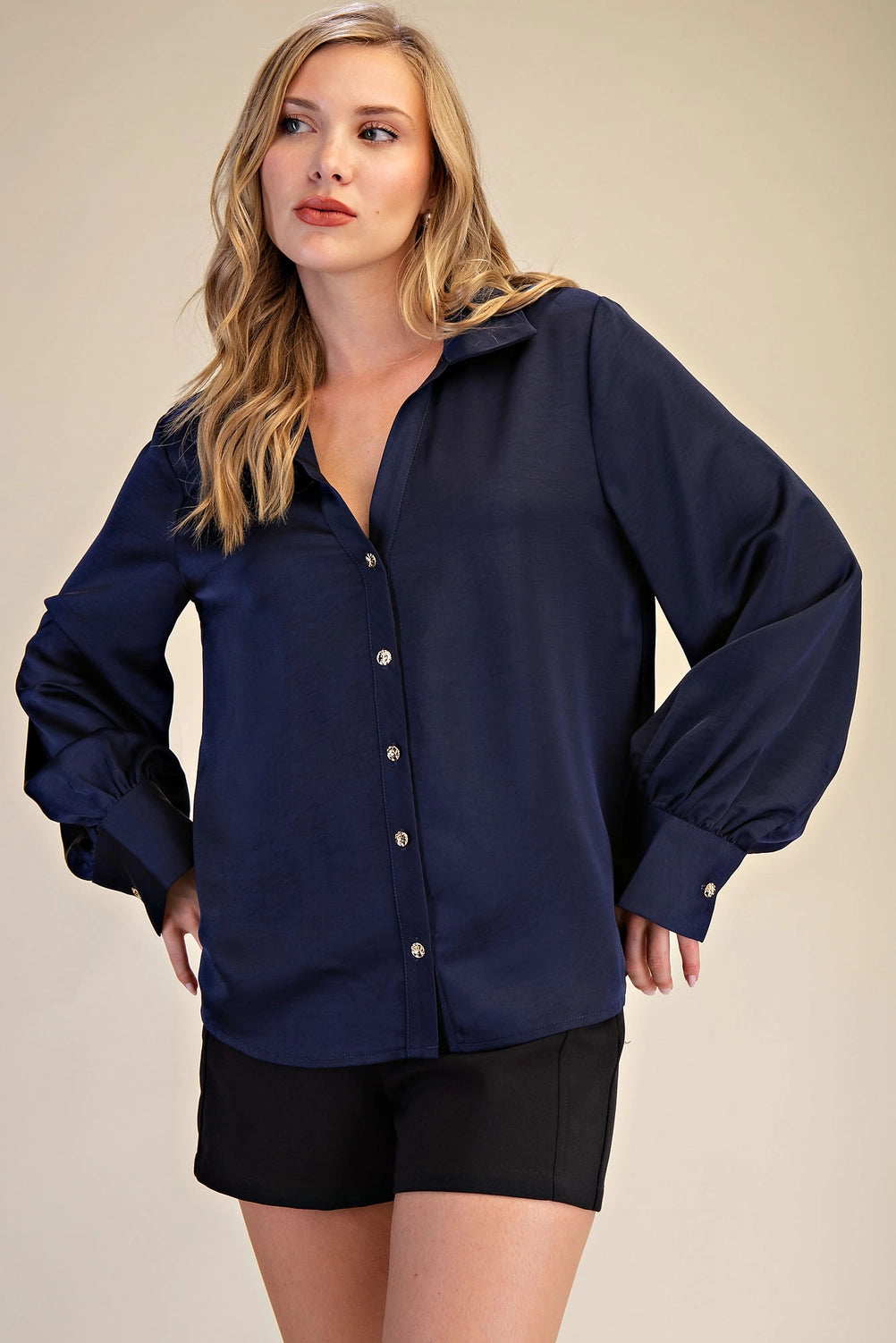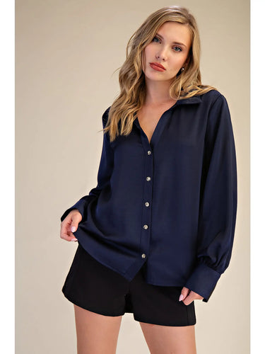 This navy satin button-up drapes effortlessly, with a smooth, glossy finish that catches the light just right and softly structured long sleeves that feel relaxed yet intentional. Sparkling silver-toned buttons add a subtle point of interest, giving the shirt a hint of shine without stealing the show. Wear it tucked into a black pair of trousers for an office outfit or with jeans and booties for a more casual look.