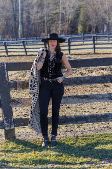 The Shadow Velvet Vest brings a luxe western edge to any outfit. Crafted from soft black velvet, it features chunky turquoise concho buttons and a flattering V-neck cut. The tank-to-vest design makes it perfect for layering, while the subtle leopard print lining adds a bold, hidden touch of personality. Style it with denim, boots, and silver jewelry for an effortlessly elevated western look.