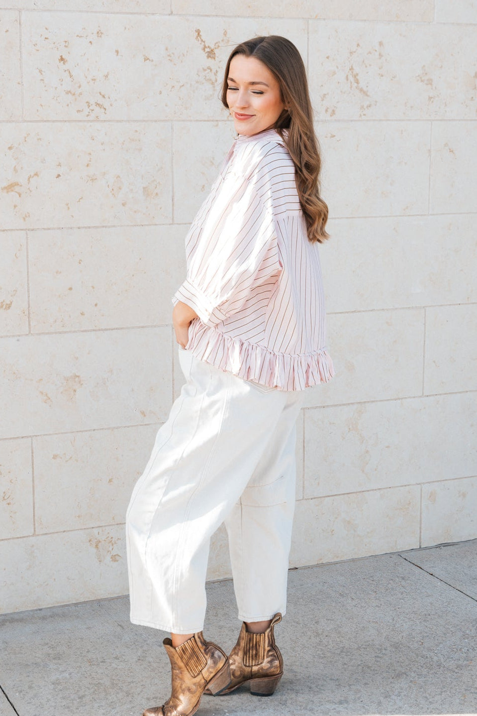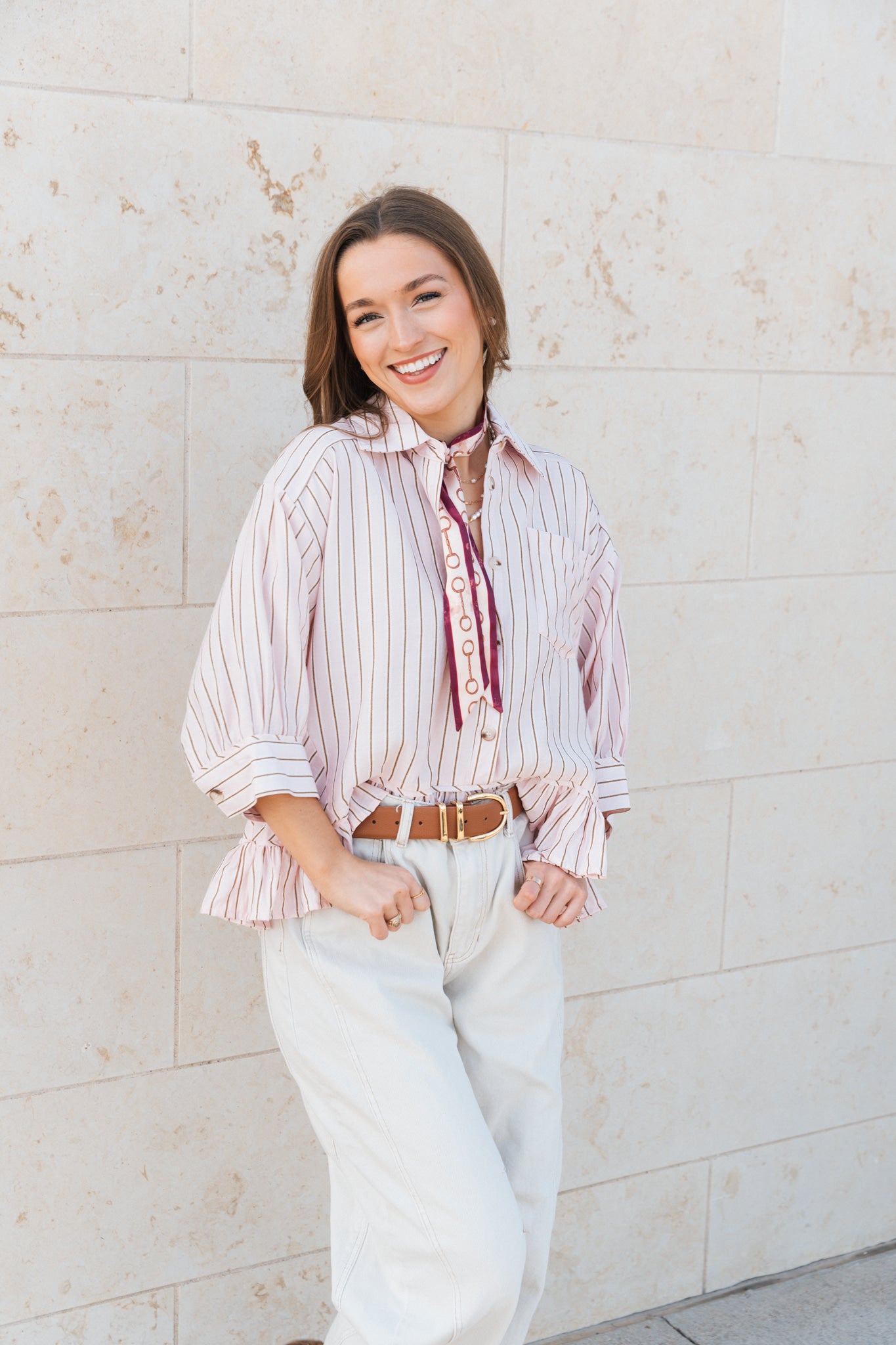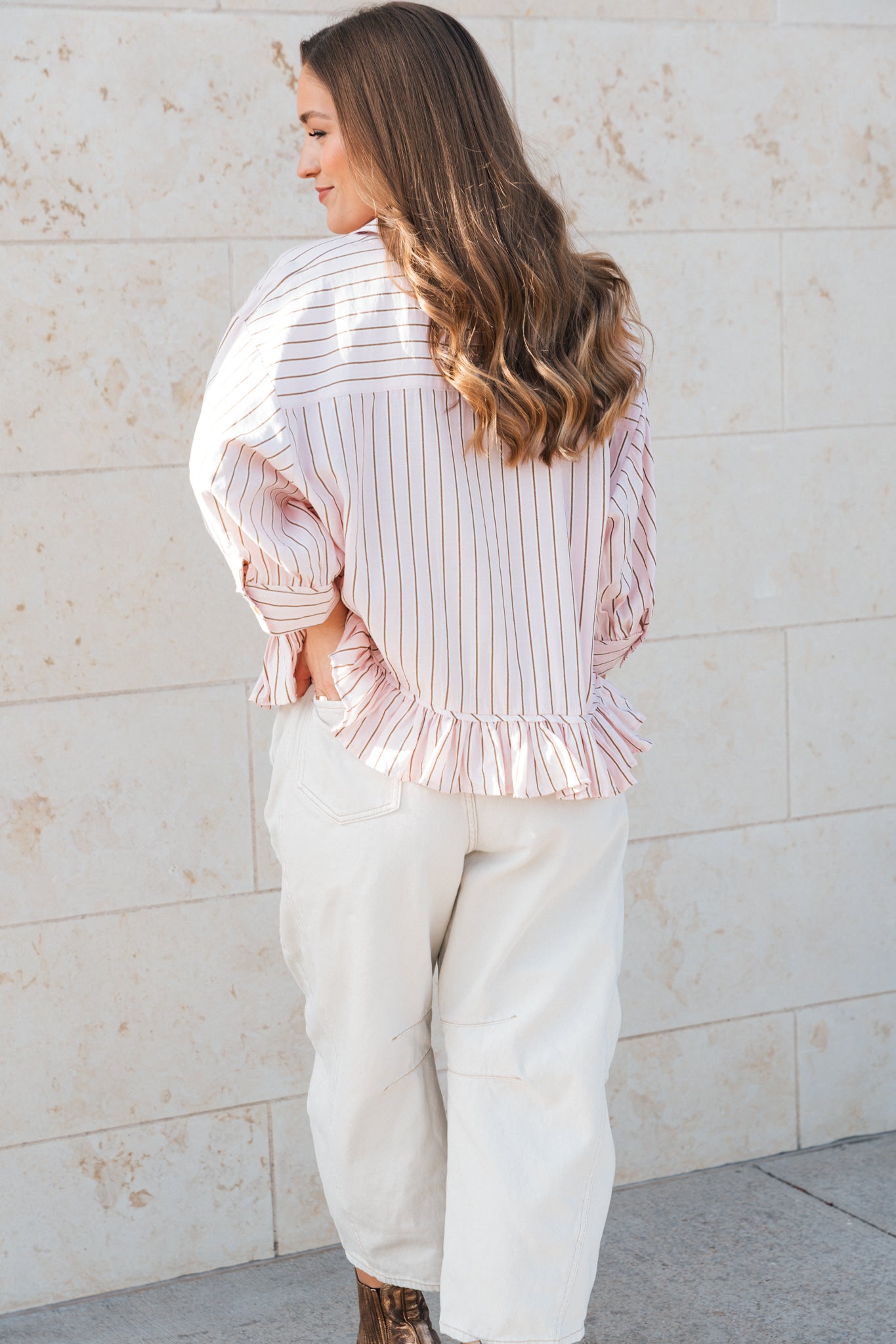 The Sweetheart Stripe Top features soft blush and cream pinstripes with subtle metallic threading for a refined, eye-catching finish. Designed with a classic collar, front button closure, single chest pocket, and cuffed elbow-length sleeves, it’s finished with a ruffled hem that sits higher in front and drapes longer in back for an effortlessly flattering and feminine fit. Pair it with denim and booties for a look that feels put-together yet easy.